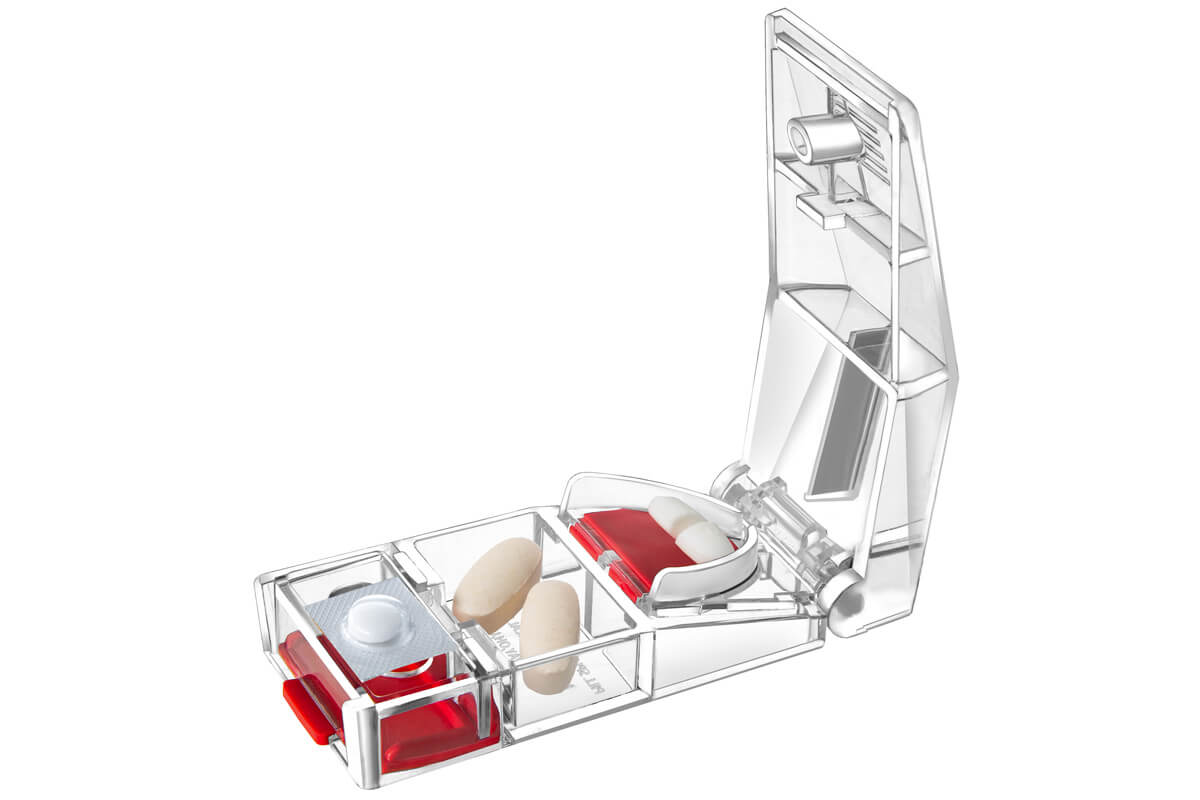 - Its innovative built-in pill puncher provides a convenient way to assist in pill removal from blister packs or unit dose packaging.