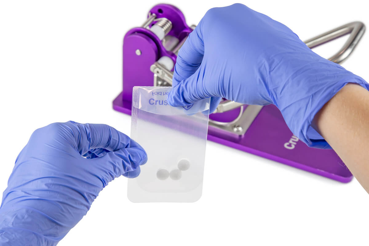 The open design ensures easy cleaning and maintenance, while Crushield heavy-duty pouches with three secure closures provide a strong, safe, and effective pill-crushing system.