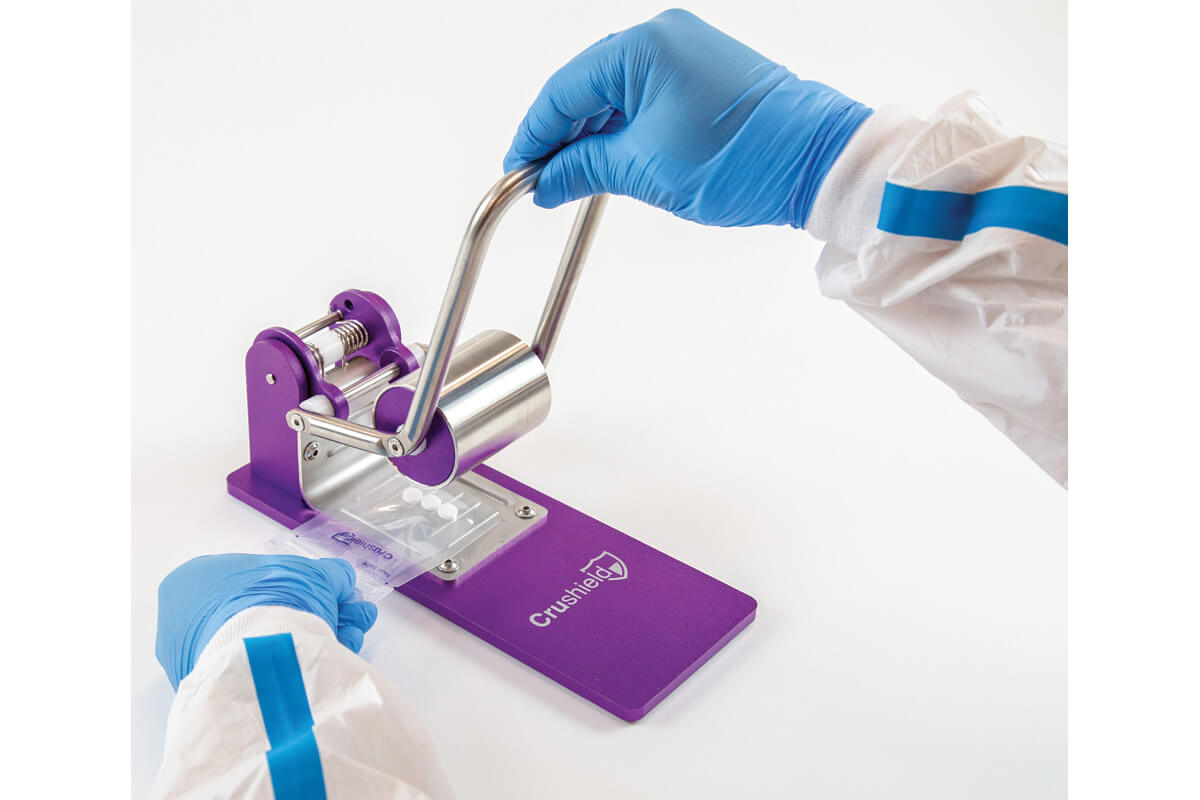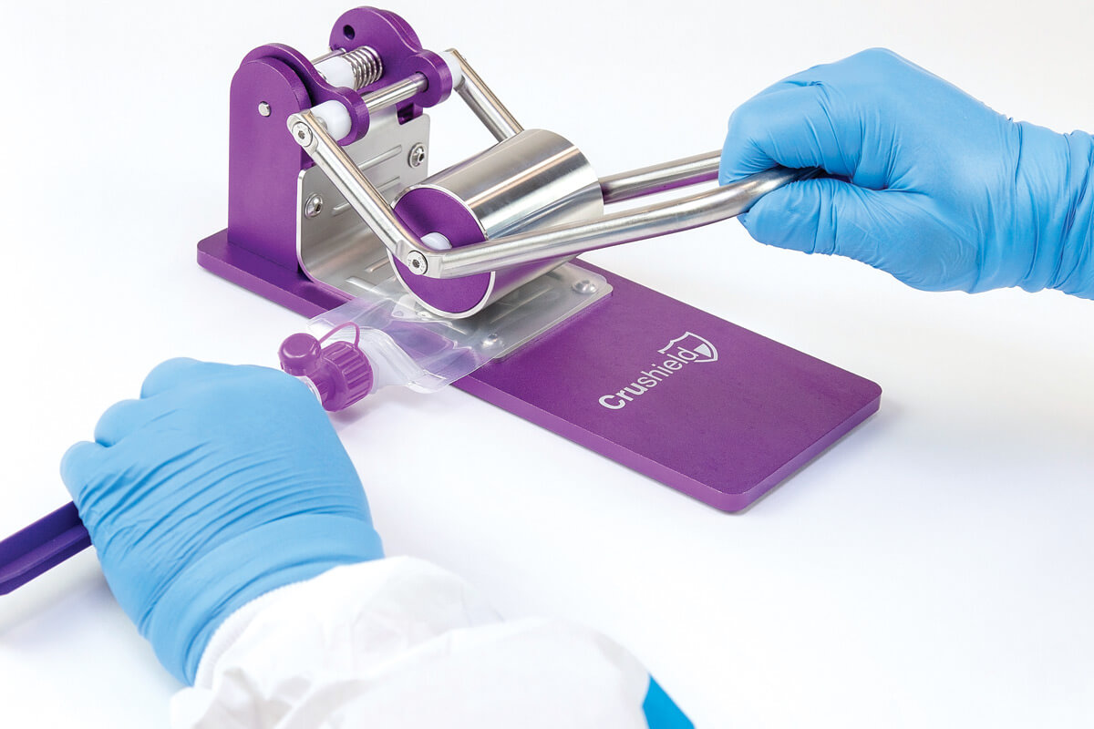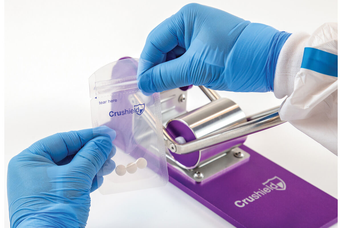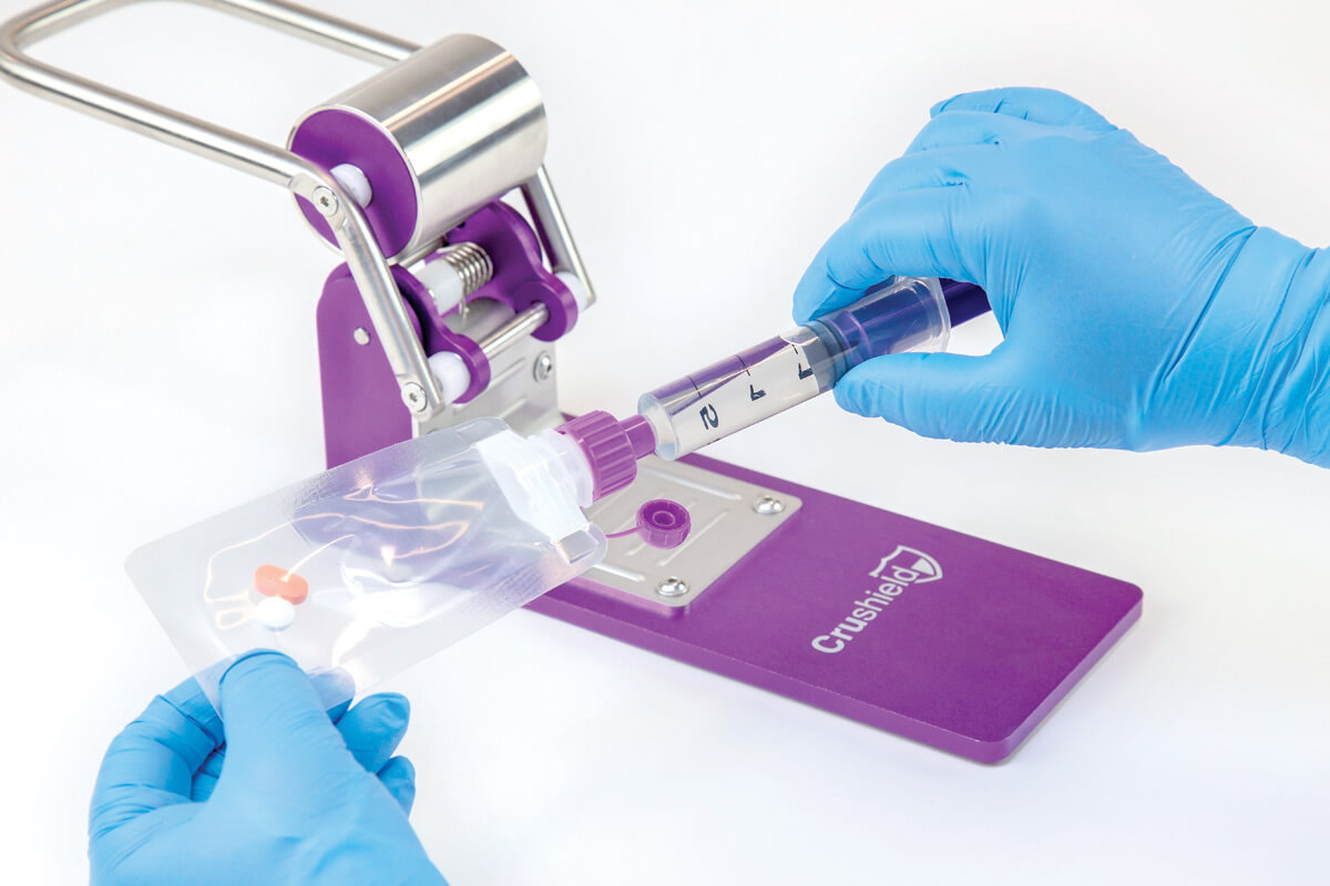 Crushield system streamlines the pill-crushing process while protecting healthcare workers from exposure to medication dust, especially when handling hazardous drugs.
